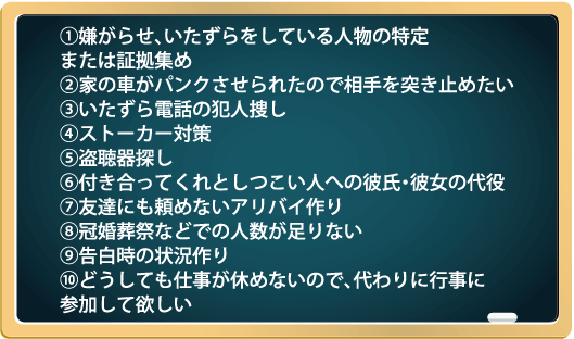 一流の工作員が、状況や、プランに応じ、様々な工作を仕掛け、お客様のお悩みを解決致します。